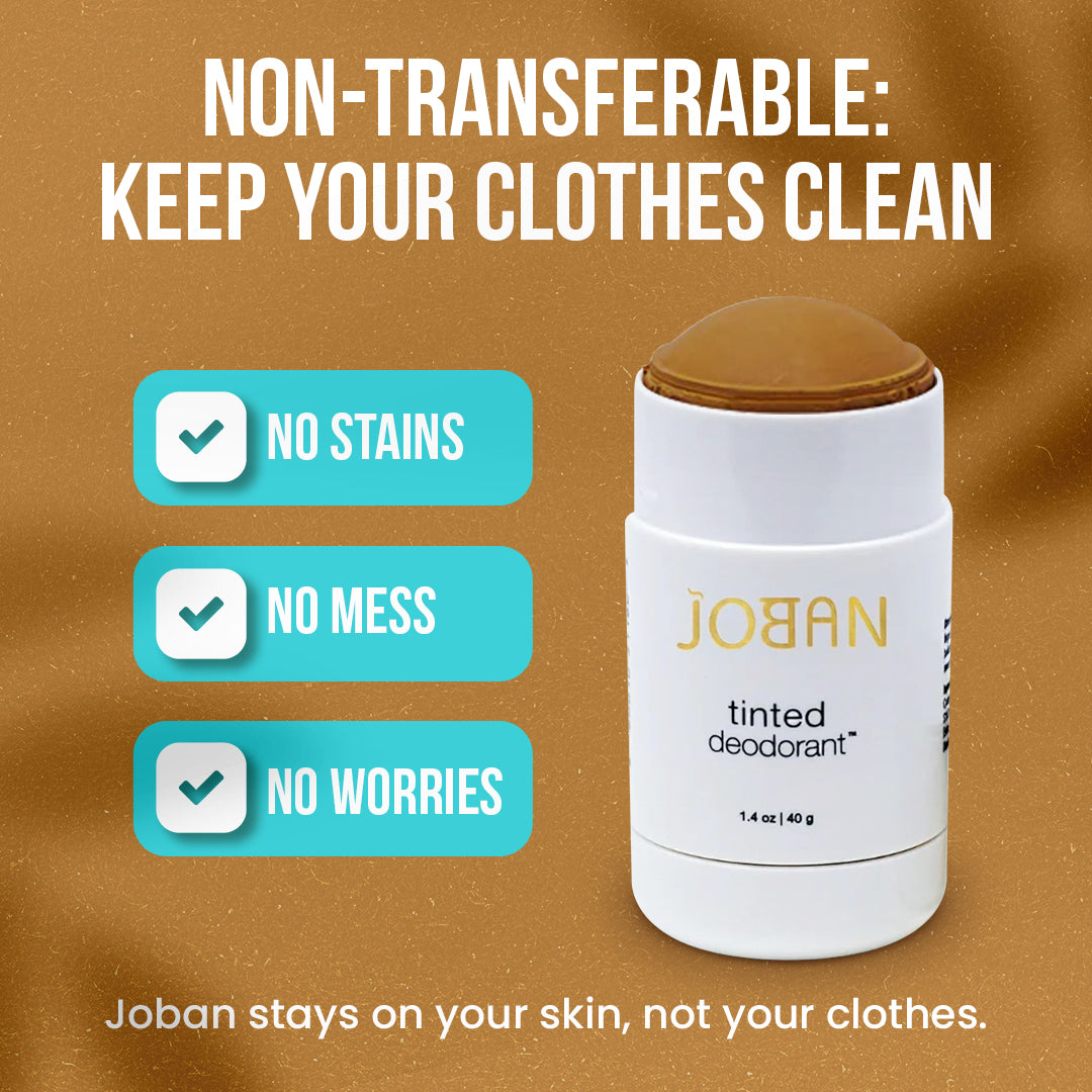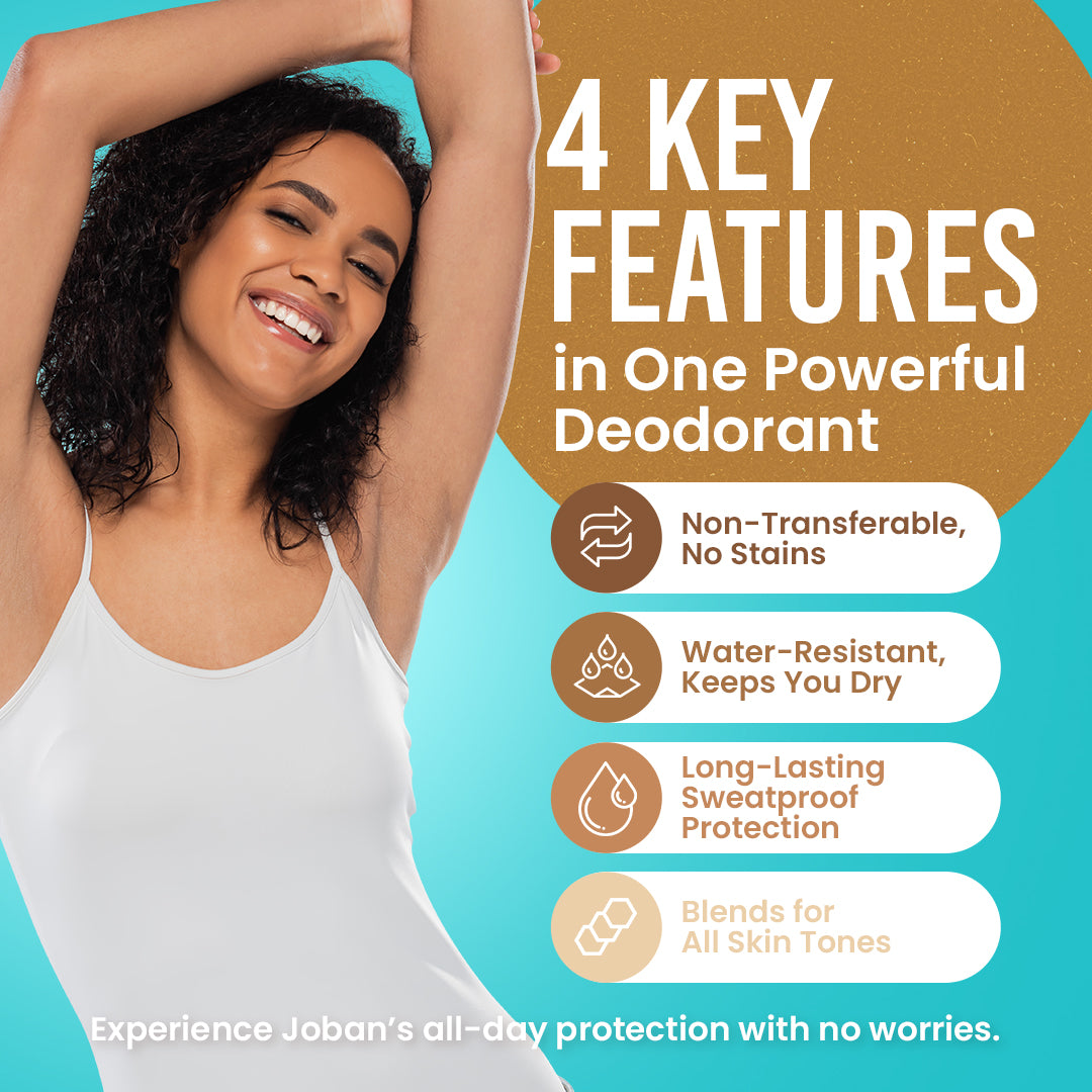• Water-resistant: Again, no sweat is what we’re all about! Keeping you dry and armpit discoloration hidden is what makes Joban work for you.